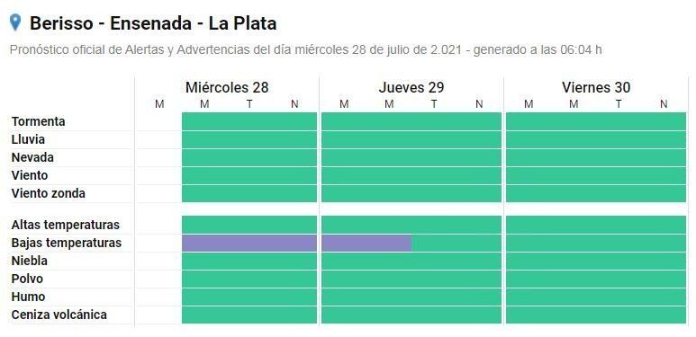El SMN también advirtió que se mantiene vigente la "advertencia violeta" lanzada el último martes a raíz de la intensidad del frío que se vive en la región. El aviso seguirá activo hasta entrado el próximo jueves y por ello las autoridades nacionales recomendaron mantenerse alertas para evitar inconvenientes.