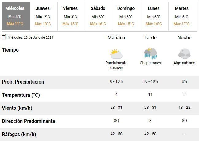 Este miércoles amaneció con una mínima apenas por debajo de los 4°C y se espera que la máxima trepe a unos 11°C, todo acompañado de un cielo parcialmente nublado y fuertes vientos que podrían alcanzar velocidades de entre 42 y 50 km/h.
