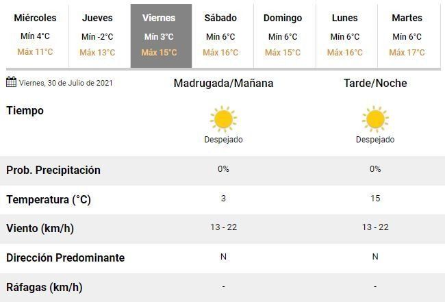 Hacia el fin de semana, en tanto, se espera un leve ascenso de la temperatura, con mínimas en torno a los 6°C y máximas que rondarán los 15 y 16°C.