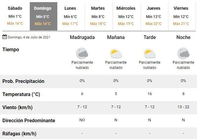 Para el domingo, en tanto, se espera una nubosidad en aumento acompañada de una temperatura que oscilará entre los 5 y los 16°C, vientos leves del norte y un buen clima.