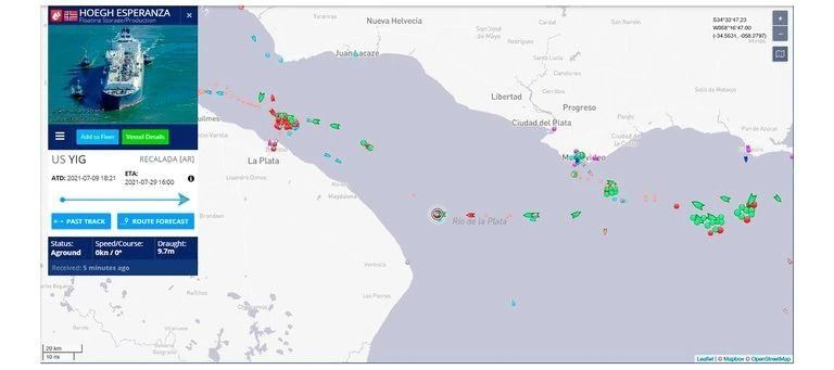 Se trata del buque de bandera noruega Hoegh Esperanza, que se dirigía a Escobar, donde se encuentra el regasificador Expedient. Según se informó, dos remolcadores intentaron desbloquear sin éxito al buque que lleva la bandera noruega, que cargar gas metano y que tiene casi 300 metros de eslora (largo) y 46 de manga (ancho).