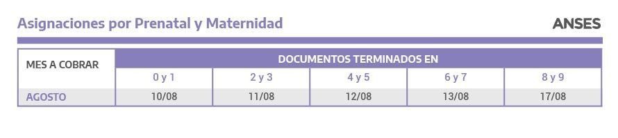 Mientras que la Asignación por Prenatal y Maternidad se pagará desde el martes 10 hasta el 17 de agosto, de acuerdo a su terminación de DNI.
