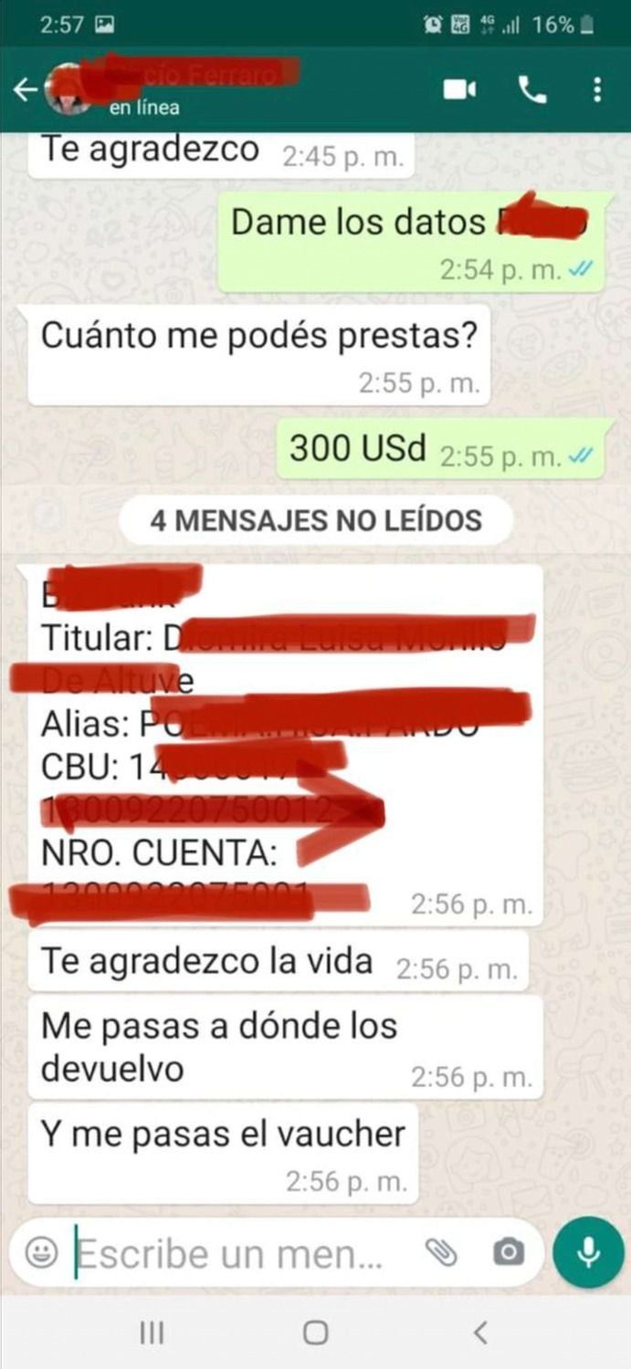 “¡¡URGENTE!! NECESITO CAMBIAR DÓLARES, POR FAVOR, TUVIMOS UN ACCIDENTE, ESTAMOS DESESPERADOS, SOLO TENGO DOLARES, ESTAMOS EN LA RUTA, PERDI MI CARTERA, TENGO 1.000 DÓLARES QUE LLEVABA EN EL BOLSILLO DEL PANTALÓN, ACABO DE COMPRAR UNA TARJETA PREPAGA Y TE ESCRIBO A TRAVÉS DE UN TELÉFONO QUE ME PRESTARON, ME PODÉS CAMBIAR LOS MIL DÓLARES, TRANSFERIRSE A LA CUENTA xxxx-xxxxxx QUE ACA UNA SEÑORA ME LA SACA POR CAJERO Y ME LA DA, YO EL LUNES TE ALCANZO LOS DÓLARES”.