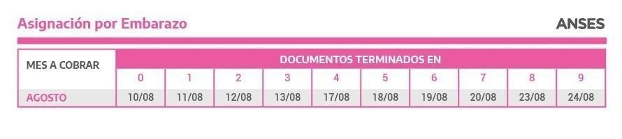 Las mujeres que perciben la AUE comenzarán a cobrar a partir del martes 10 hasta el 24, según terminación de documento de 0 a 9. Las Asignaciones de Pago Único, en tanto, estarán disponibles para todas terminaciones de DNI desde el 5 de agosto al 10 de septiembre y desde el 28 de agosto hasta el 10 de septiembre para la segunda quincena.