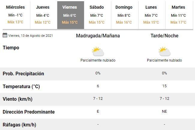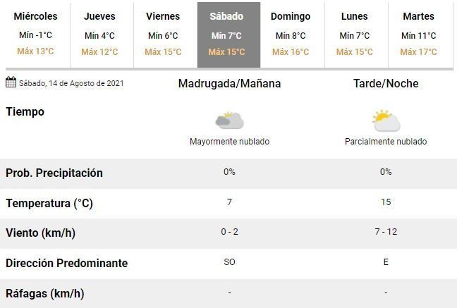 Todo será la antesala de un buen fin de semana. Aunque con temperaturas más bien frescas, los expertos anticipan dos días de descanso con buen clima y escasa nubosidad, enmarcados en mínimas de 7 y 8°C y máximas de 15 y 16°C durante el sábado y el domingo próximos, respectivamente.
