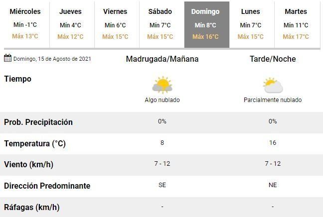 Para lo que resta de la semana, en tanto, se aguarda por días de sol y escasa nubosidad, con temperaturas de entre 4 y 12°C el jueves y 6 y 15°C el viernes.