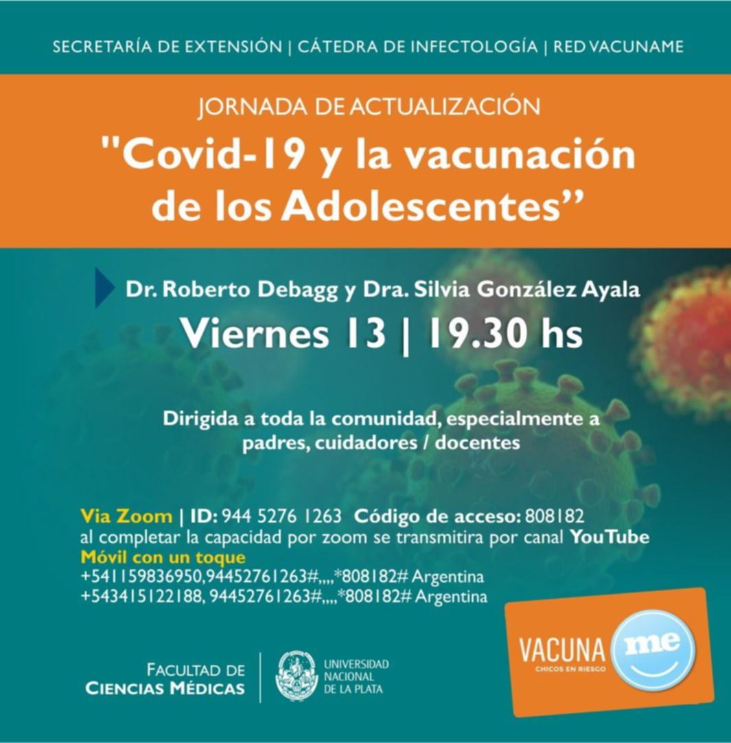 La Secretaría de Extensión, junto con la Cátedra de Infectología de la Facultad de Ciencias Médicas de la UNLP y la Red VacunaMe, organizan la jornada "COVID-19 y la vacunación en adolescentes" que tendrá lugar este viernes 13 a las 19.30, vía Zoom.