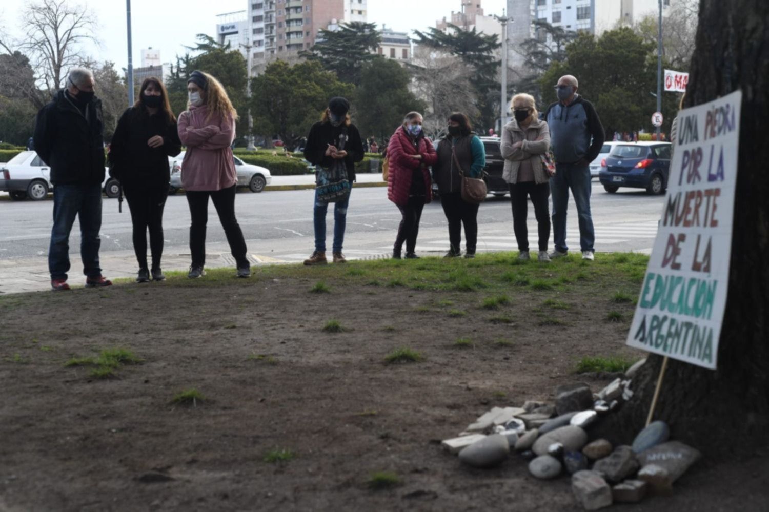 En ese marco, un puñado de platenses se acercó hasta los jardines del Palacio Municipal para colocar una piedra con el nombre de la persona que falleció por COVID. Además, los manifestantes colocaron una roca más “por la muerte de la educación en Argentina”.
