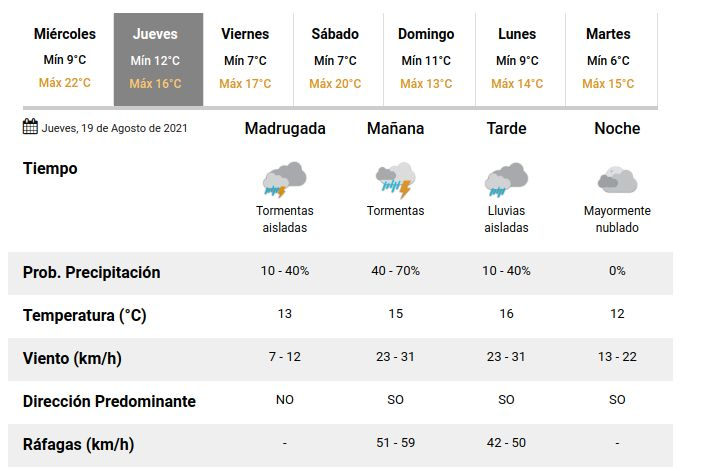 Según anticipó el Servicio Meteorológico Nacional (SMN), para la madrugada y la mañana del jueves se esperan tormentas aisladas y ráfagas de viento de entre 51 y 59 KM/H.