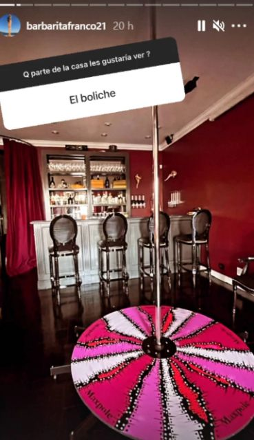 Así dio a conocer algunos de los lugares más raros que comparte con el abogado nacido en la capital bonaerense, como por ejemplo, un boliche, en el que realizan fiestas para sus amigos y familiares. En el fondo, puede apreciarse una barra bien nutrida de copas y bebidas junto a cuatro sillas altas con respaldo, mientras que cuenta hasta con un caño de pole dance en el medio de la pista.