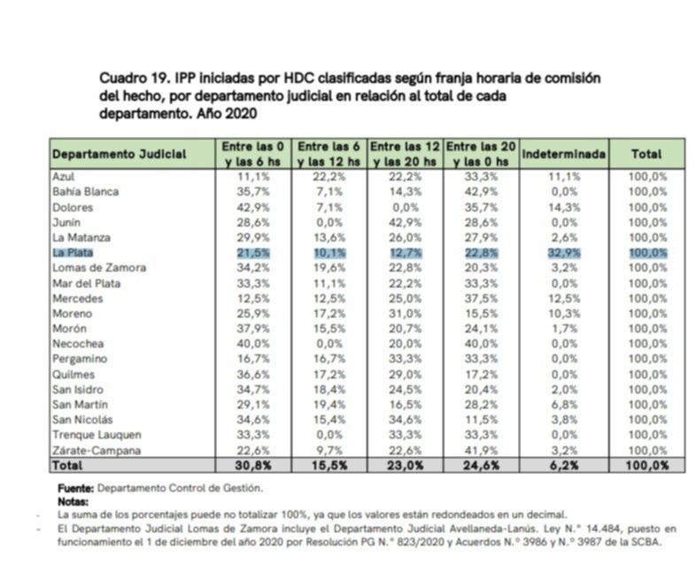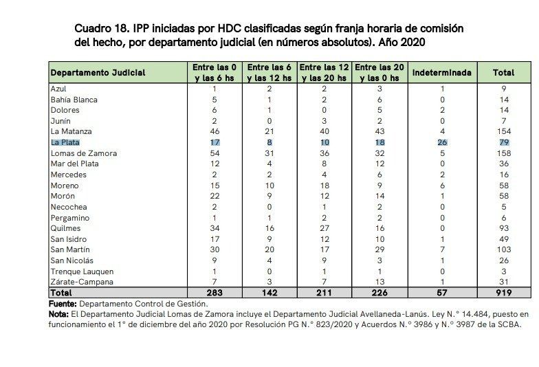 La noche es el momento en el que la inseguridad crece aún más en el Departamento Judicial de La Plata. De los 79 homicidios dolosos denunciados en 2020, el 44,3 % de se consumaron en dos bandas horarias bien determinadas. Entre las 20 y las 0 se ejecutó el 22,8% de los crímenes. La otra franja horaria más peligrosa fue desde las 0 hasta la 6, donde se cometieron el 21,5% de los hechos, según se desprende del informe difundido por la Procuración General de la Suprema Corte de Justicia de la provincia de Buenos Aires en base a las Investigaciones Penales Preparatorias (IPP) iniciadas en los 135 distritos bonaerenses.