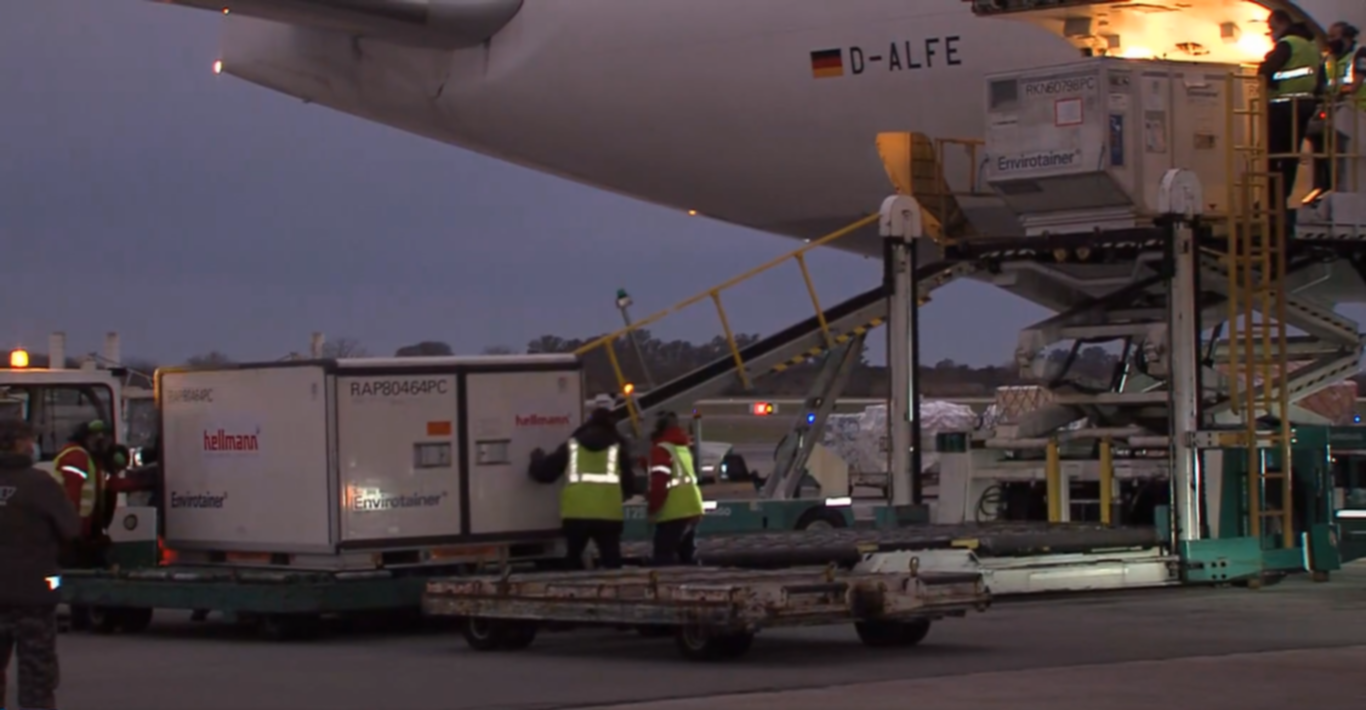El nuevo lote de 768.000 vacunas del laboratorio chino Sinopharm arribó al Aeropuerto Internacional de Ezeiza a bordo del vuelo LH8264 de la empresa Lufthansa.