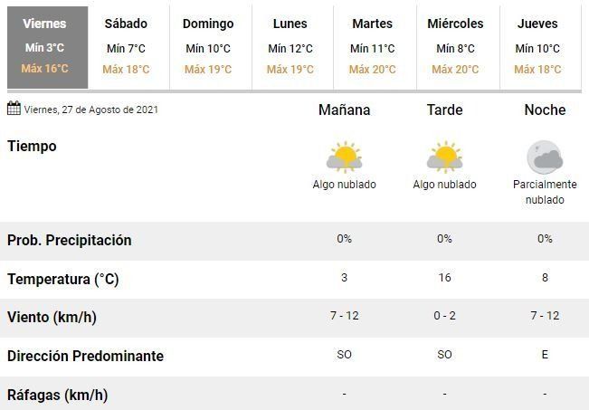 El viernes le pone punto final a una semana de buen clima y, como no podía ser de otra manera, los especialistas del Servicio Meteorológico Nacional (SMN) anticipan una jornada fresca pero ideal para disfrutar del sol aire libre. De acuerdo con los expertos, él último día de la semana comenzó con una mínima de apenas 3°C, pero anticipan una máxima de 16°C acompañada de sol, un cielo parcialmente nublado y una humedad que ronda el 63%.