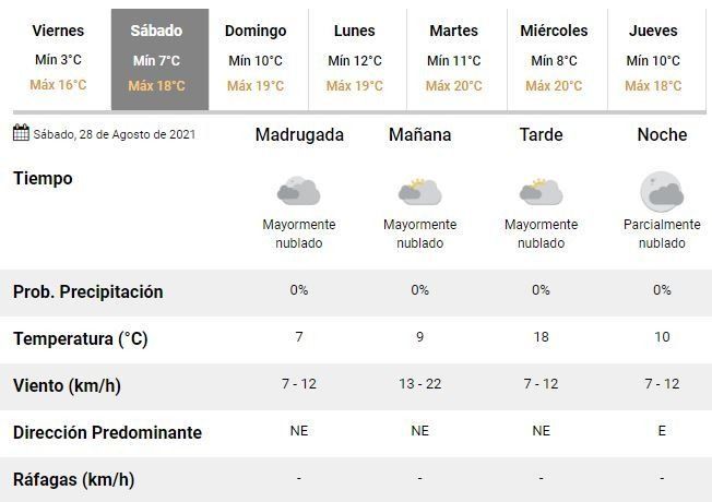 A pesar del frío, los expertos anticipan que la temperatura irá en aumento en las próximas horas y se prevé que oscilen entre 7 y 18°C el sábado y 10 y 19°C el domingo. De acuerdo con los meteorólogos argentinos, todo estará enmarcado en dos jornadas con cielo parcial a mayormente nublado y vientos leves soplando del norte y noreste del país.