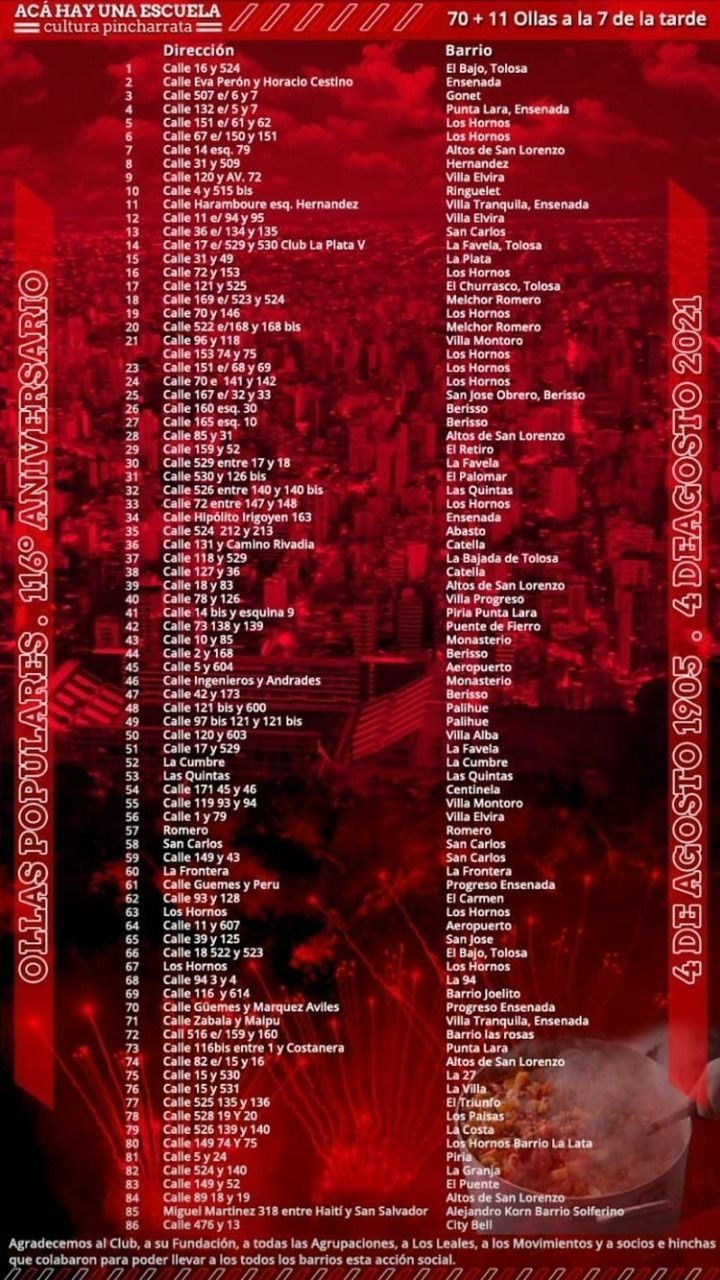 En el marco de un nuevo aniversario de la fundación del club Estudiantes de La Plata, la familia Pincha organizó una cruzada solidaria y se puso a disposición de quienes más lo necesitan. En este sentido, la Fundación Estudiantes y las distintas agrupaciones y filiales de la institución llevaron adelante más de 70 ollas populares en distintos puntos de la ciudad.