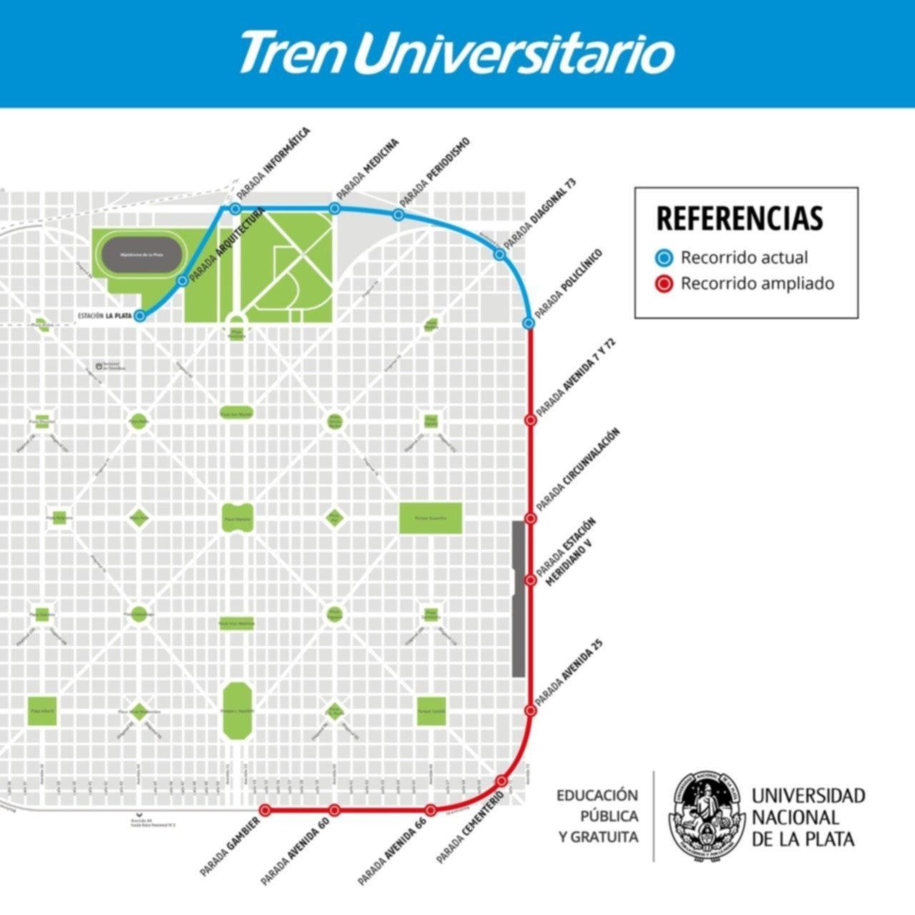 El proyecto de extensión del Tren Universitario de La Plata, que pertenece al ramal 47 de la línea Roca- contempla la creación de cuatro nuevas paradas intermedias y se enmarca dentro del Plan de Modernización del Transporte que lleva adelante el Gobierno nacional.