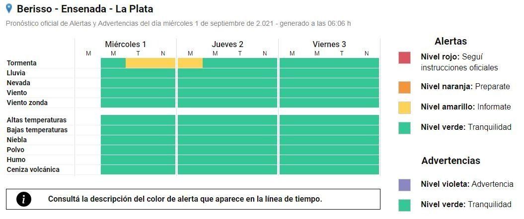Además señalaron que sigue vigente el Nivel de Atención del Riesgo (NAR) Amarillo debido a las tormentas y precipitaciones de variada intensidad que podrían registrarse en las últimas horas del miércoles y las primeras del próximo jueves.