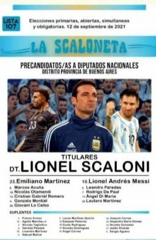 El reciente cruce de la selección argentina y el llanto emocionado de Lionel Messi también aparecieron insólitamente en la jornada de elecciones. Una boleta propuso votar a "la scalonetta" y circuló entre los usuarios de Twitter, con la foto del entrenador del seleccionado de fútbol y su habitual atuendo deportivo.