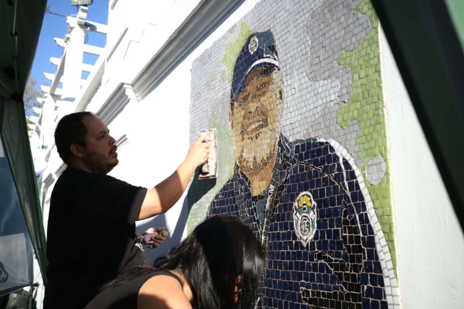 Alrededor de las 17, los fanáticos se fueron congregando en las inmediaciones del estadio Juan Carmelo Zerillo, donde se llevó adelante la presentación del mural en honor a su memoria. Los presentes estallaron cuando sacaron la bandera que lo tapaba y vieron al Diez con la indumentaria azul y blanca.