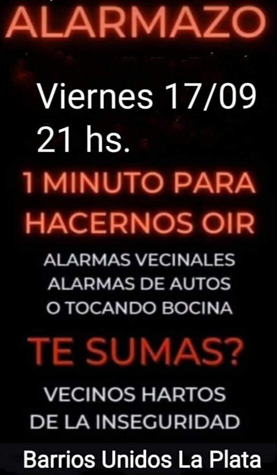 Vecinos nucleados en Barrios Unidos La Plata realizarán este viernes a las 21 un “alarmazo” para manifestar su hartazgo ante el incremento de la inseguridad en distintos puntos de la la ciudad y la región.