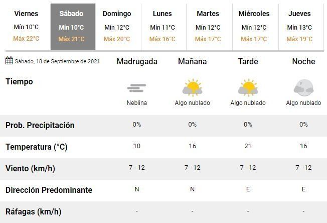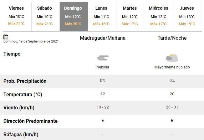 La buena noticia es que el buen tiempo se extendería además a lo largo del próximo fin de semana, con un sábado con poca nubosidad y una temperatura de 10 a 21°C y un domingo algo más inestable, con neblinas en las primeras horas de la mañana y nubosidad durante la tarde, pero sin lluvias y máxima de 20°C.