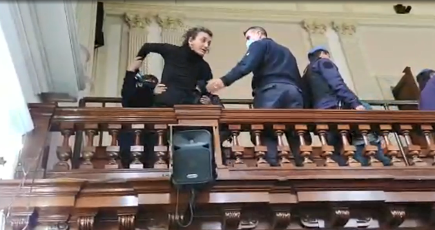 La presidenta del cuerpo Ileana Cid pidió en primera instancia desalojar el lugar, lo cual derivó en una intervención policial que generó tensión. "Pedimos la palabra, queremos la nulidad de la sesión de las tierras a la Iglesia y que los responsables de votarla no expliquen por qué lo hicieron", gritaron desde las barras.