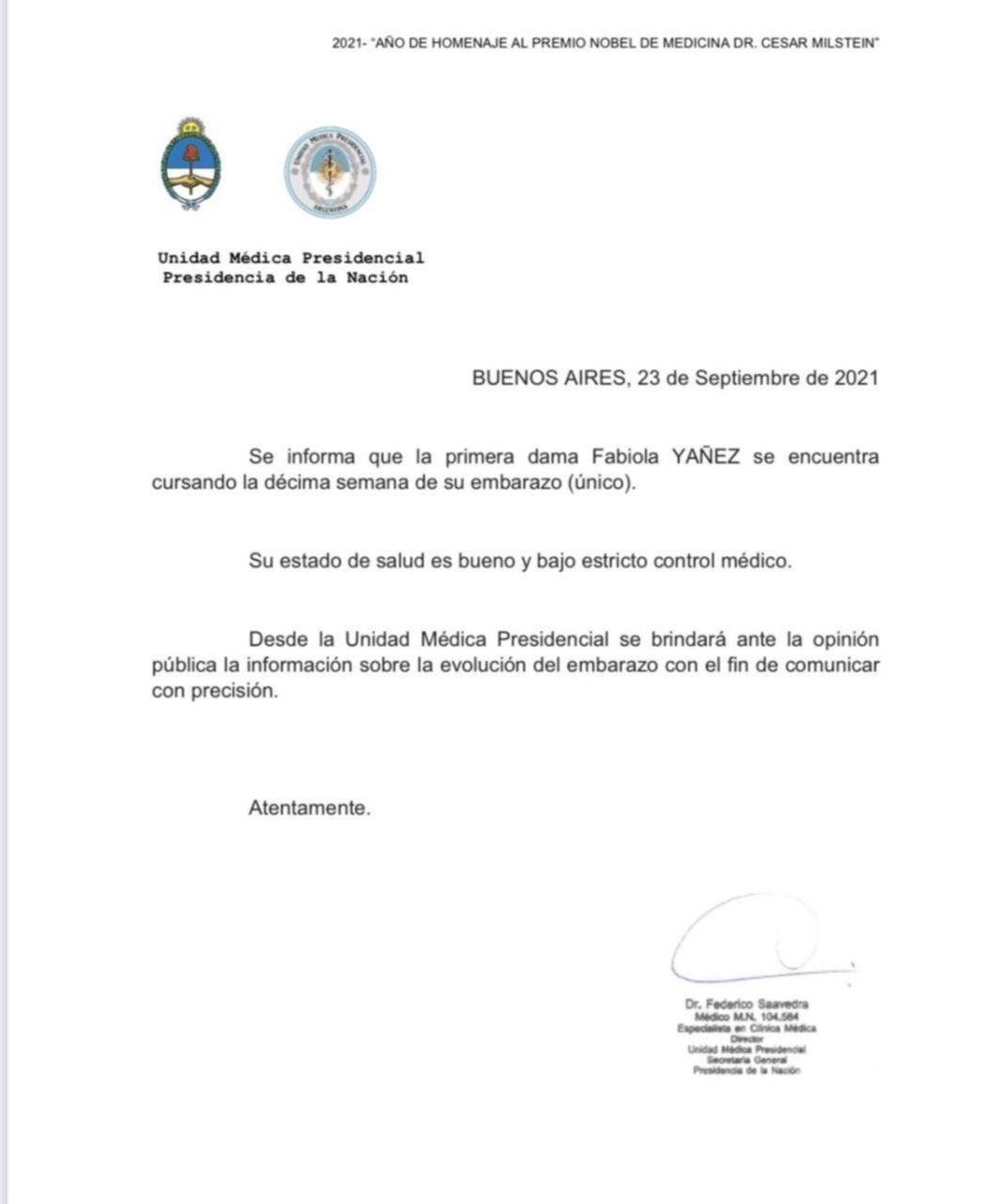 En el escrito también se aclara que el estado de salud de la esposa de Alberto Fernández es bueno y está bajo “bajo estricto control médico”. “Desde la unidad médica presidencial se brindará ante la opinión pública la información sobre la evolución del embarazo con el fin de comunicar con precisión”, concluye el informe.