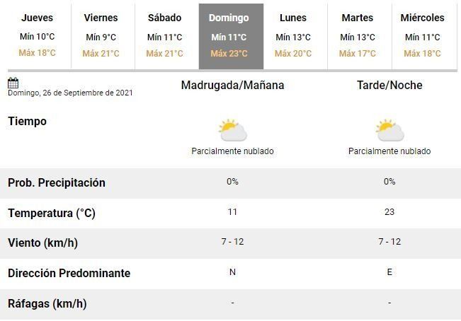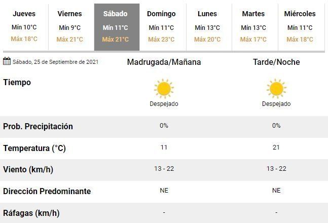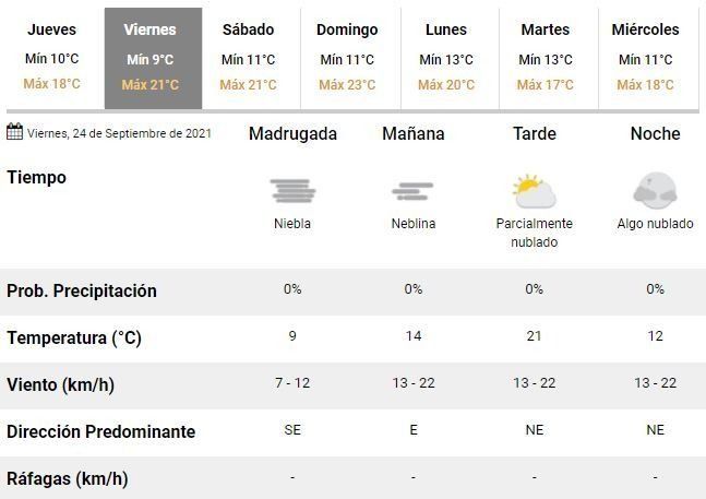 El mal tiempo, sin embargo, será la antesala de un sábado inmejorable, totalmente despejado, con una mínima prevista en los 11°C y una máxima que llegaría a unos cálidos 21°C.