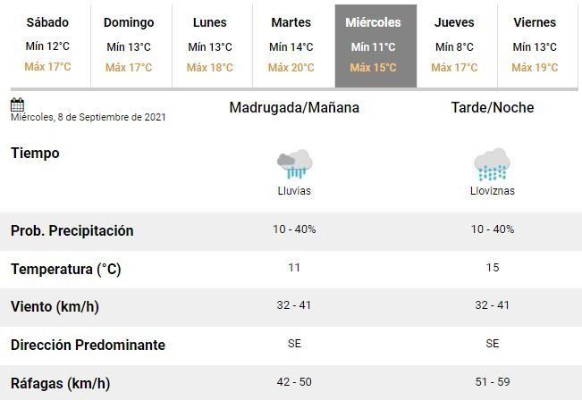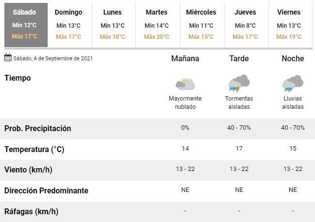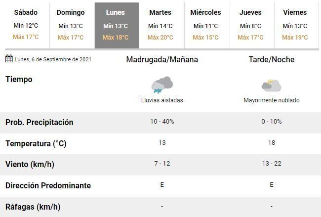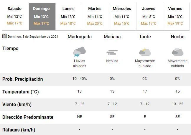 Las previsiones no son nada alentadoras y es que para el domingo, en tanto, se esperan condiciones similares, con una mínima prevista en 13°C y una máxima que alcanzaría los 17°C y alguna chance de lluvias durante las primeras horas de la mañana.