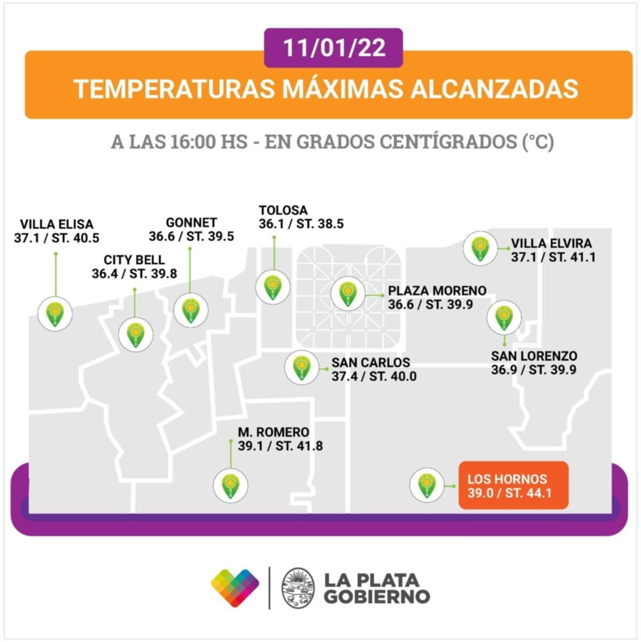 Respecto a los datos registrados por el área especializada, a las 16 de este martes la temperatura alcanzó los 39.1ºC en Melchor Romero; 39ºC en Los Hornos; 37.4ºC en San Carlos; mientras que en Villa Elvira y Villa Elisa se llegó a los 37.1ºC. Por su parte, Altos de San Lorenzo, Plaza Moreno y Gonnet registraron una temperatura máxima de 36.9ºC y 36.6ºC, respectivamente; al tiempo que City Bell y Tolosa también sobrepasaron los 36ºC.
