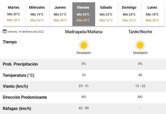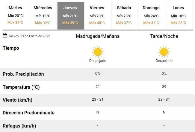 El martes el cielo estará parcialmente nublado con vientos moderados y el ambiente estará caluroso, con una mínima de 24°C y una máxima de 38°C. Aunque también se espera un marcado y temporario descenso de la temperatura en horas de la noche debido a una momentánea rotación del viento desde el sur.