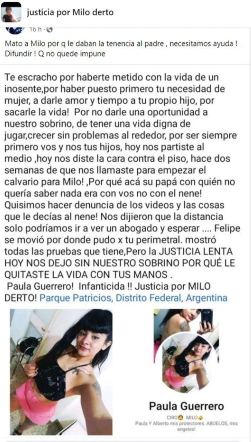 En los días siguientes, el papá comenzó a a recibir amenazas de parte de la madre de su hijo, quien le advertía que antes de ceder la tenencia del nene, lo mataba y luego se mataba ella. Incluso, como afirmó el papá, subió un video a sus redes sociales en el que se la escucha decirle a Milo: "Me hubiera gustado que conocieras a tu tío".