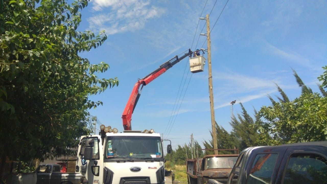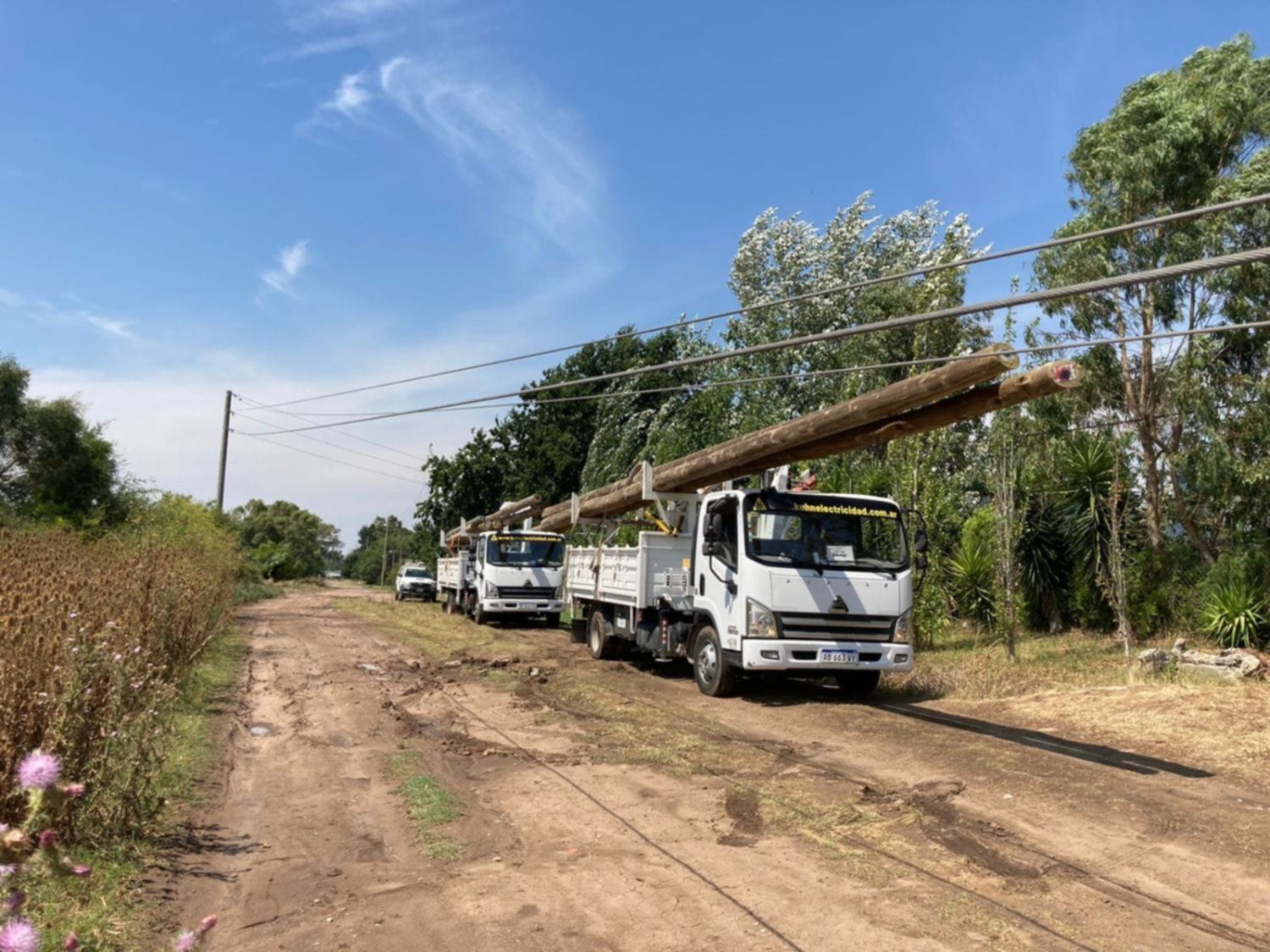 Los trabajos implican el retiro de árboles o ramas y el despliegue de equipamiento pesado, utilizando hidroelevadores e hidrogrúas para reemplazar la postación y las redes que dañadas en el contexto del evento climático, en zonas anegadas o de difícil acceso.