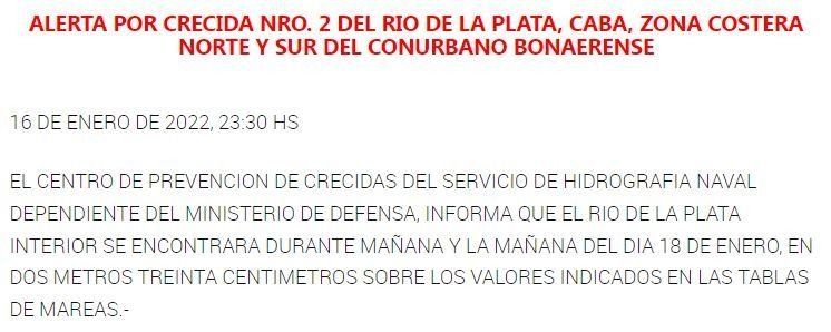 El Centro de Prevención de Crecidas del Servicio de Hidrografía Naval, informó que entre este lunes y martes, el río se encontrará en 2,30 metros por sobre los valores indicados en la tabla de mareas y alcanzaría una altura de hasta 3,20 metros alrededor de las 5.30 de la próxima jornada.