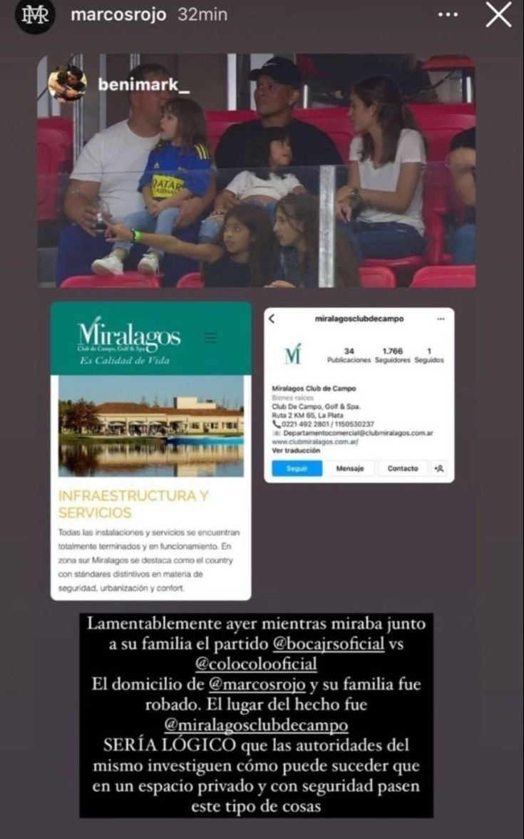 "Lamentablemente, ayer mientras miraba junto a su familia el partido Boca vs. Colo Colo, el domicilio de Marcos Rojo y su familia fue robado. El lugar del hecho fue Miralagos Club de Campo. Sería lógico que las autoridades del mismo investiguen cómo puede suceder que en un espacio privado y con seguridad pasen este tipo de cosas", reza el mensaje que el deportista compartió en su cuenta de Instagram.