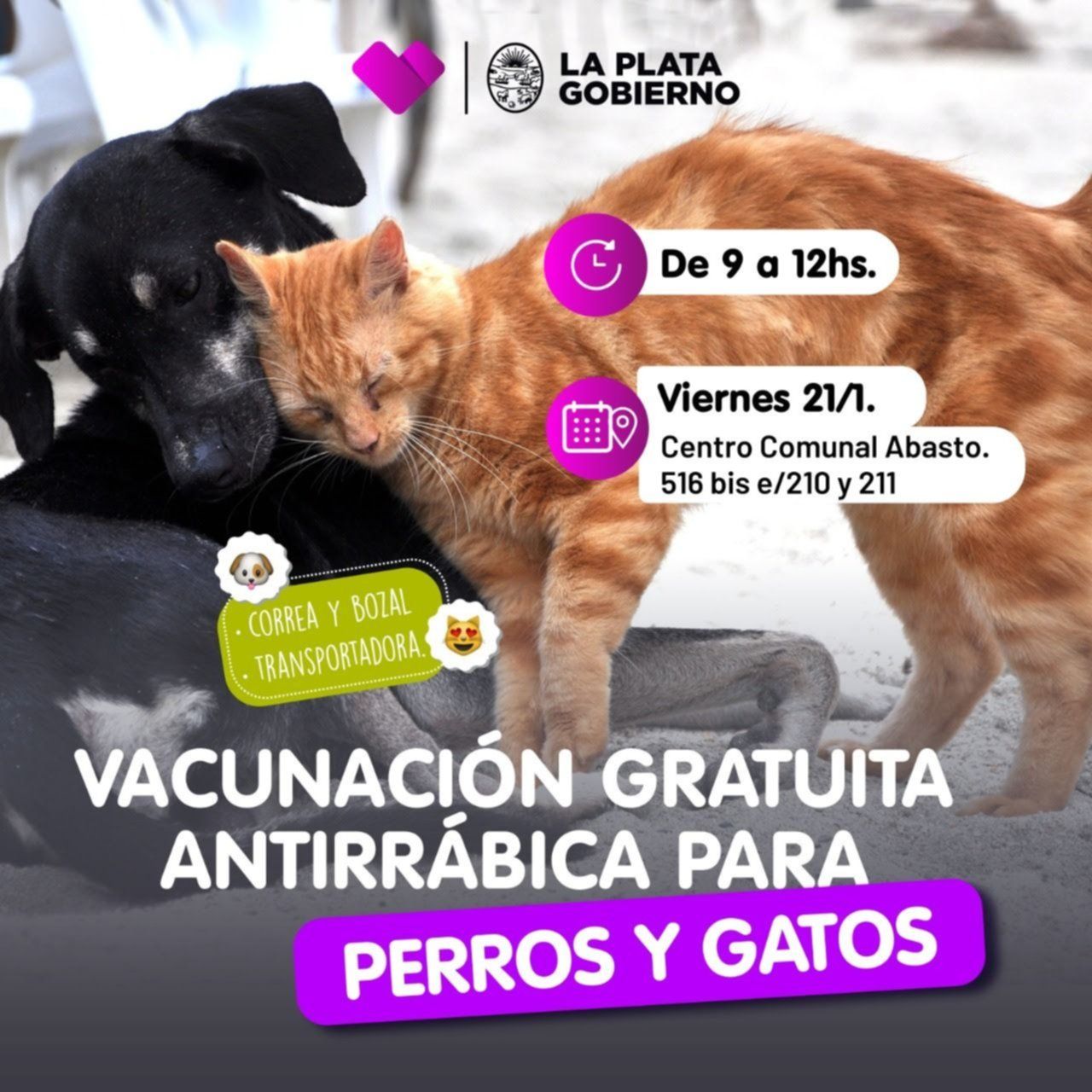 El Municipio continúa con la campaña de asistencia veterinaria en distintos barrios de la ciudad. En esta oportunidad, se desarrollará una nueva jornada de vacunación antirrábica para perros y gatos en la localidad de Abasto.