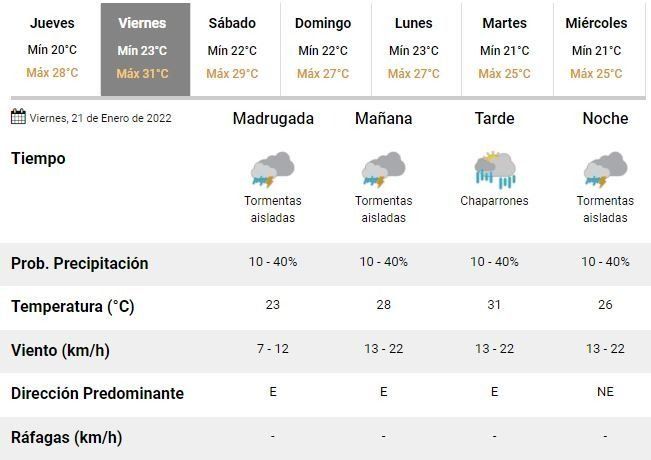 Para el viernes se aguarda una jornada completamente pasada por agua, con tormentas y lluvias aisladas desde las primeras horas y hasta el cierre mismo del día, acompañadas de por una máxima que trepará incluso hasta los 31°C. Será la antesala de un fin de semana con poco para disfrutar.