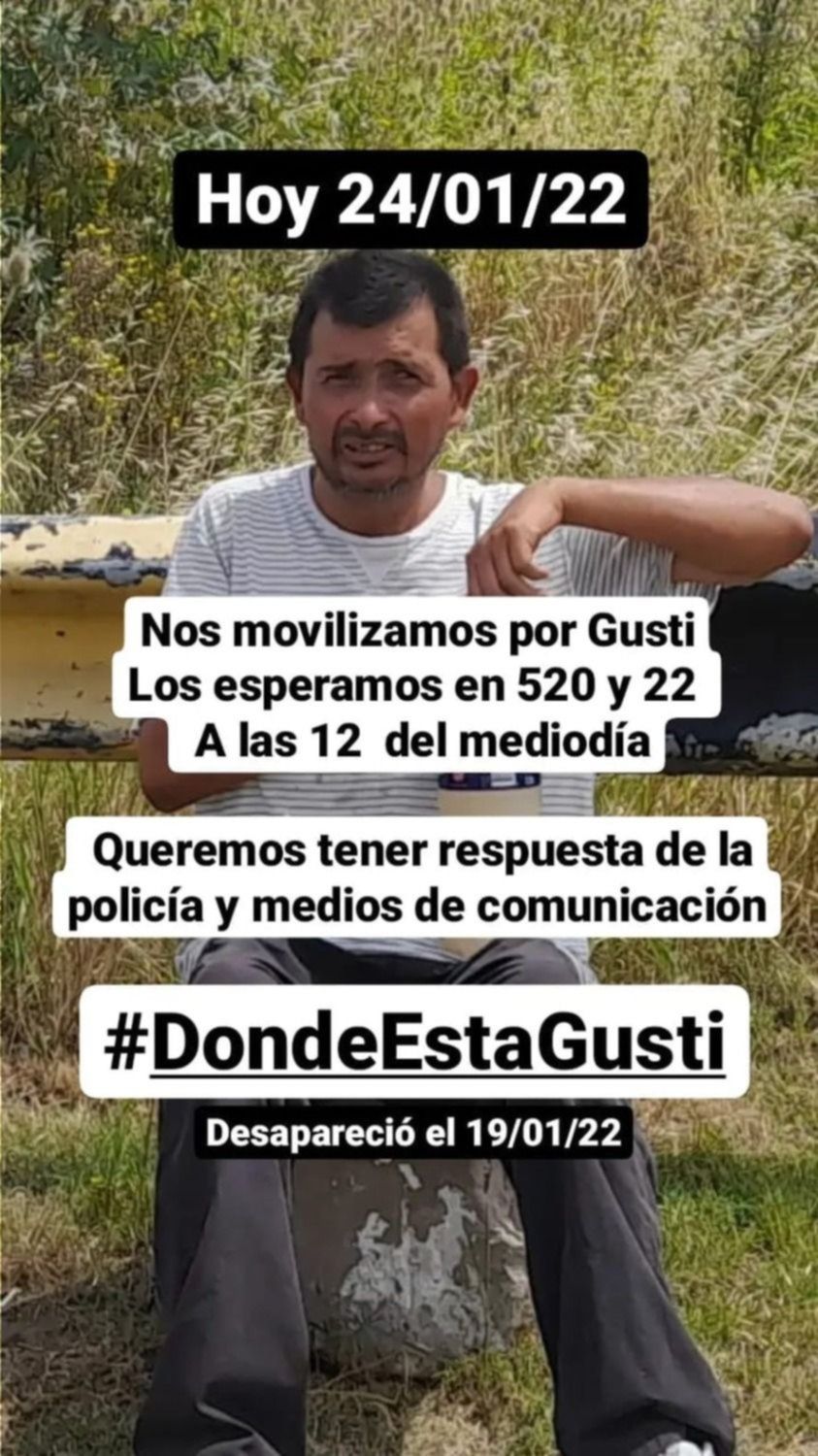 La publicación se viralizó rápidamente, pero todavía nadie sabe nada sobre dónde está Gustavo o en qué estado se encuentra. Es por eso que, este lunes sus familiares se movilizarán hasta 520 y 22 y cortarán la transitada avenida desde las 12, para exigir que la investigación avance con mayor velocidad.