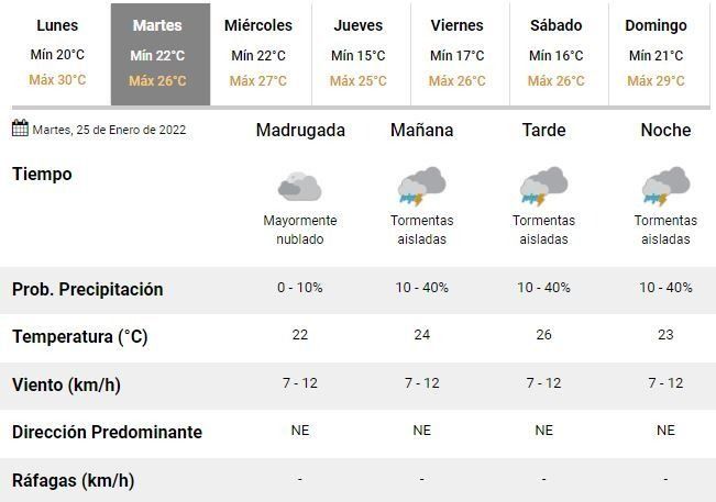 De acuerdo con las previsiones del SMN, la segunda jornada de la semana transcurrirá inestable con una temperatura de entre 22 y 26°C y con leves chances de lluvias y tormentas desde la mañana y hasta el cierre del día.