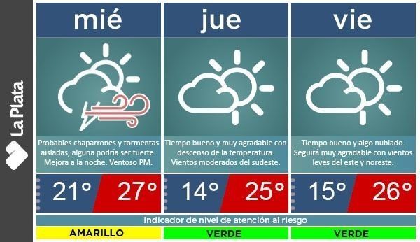 Los meteorológos platenses también informaron cómo estarán las condiciones climáticas durante los próximos días y adelantaron que para este miércoles se esperan algunos chaparrones y tormentas aisladas que podrían llegar a ser localmente fuertes. El tiempo, sin embargo, mejorará hacia la noche. La temperatura, pro su parte, oscilará entre 21 y 27°C.