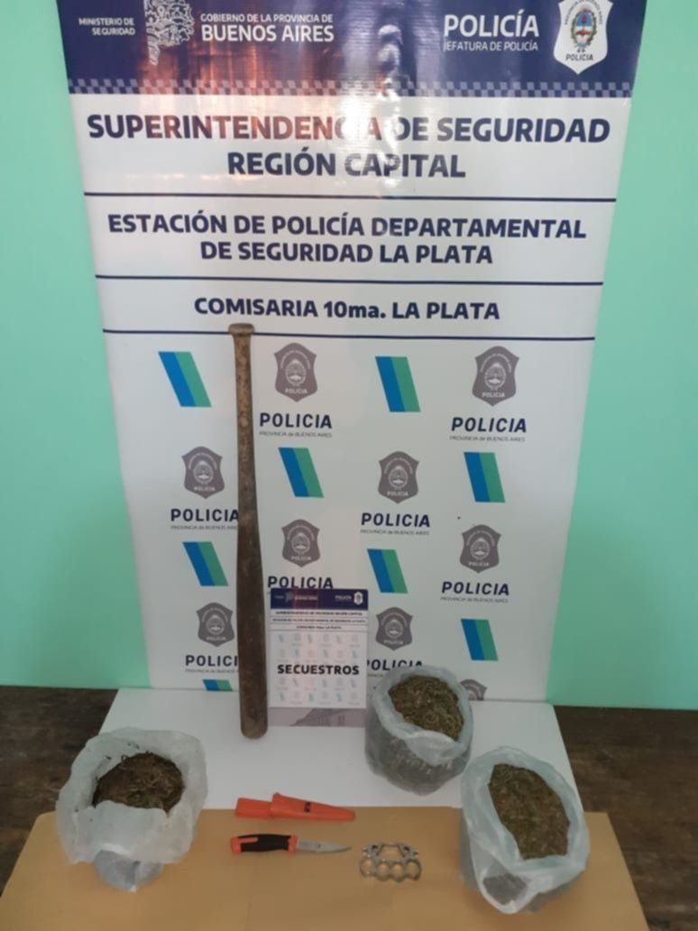 Los uniformados pudieron secuestrar una nudillera, el bate de béisbol, un cuchillo y tres bolsas de nylon conteniendo cada una 300 gramos de marihuana. Los seis aprehendidos fueron trasladados a la Comisaría 10ma donde quedaran bajo la intervención de la UFI N 17 del Departamento Judicial de La Plata.