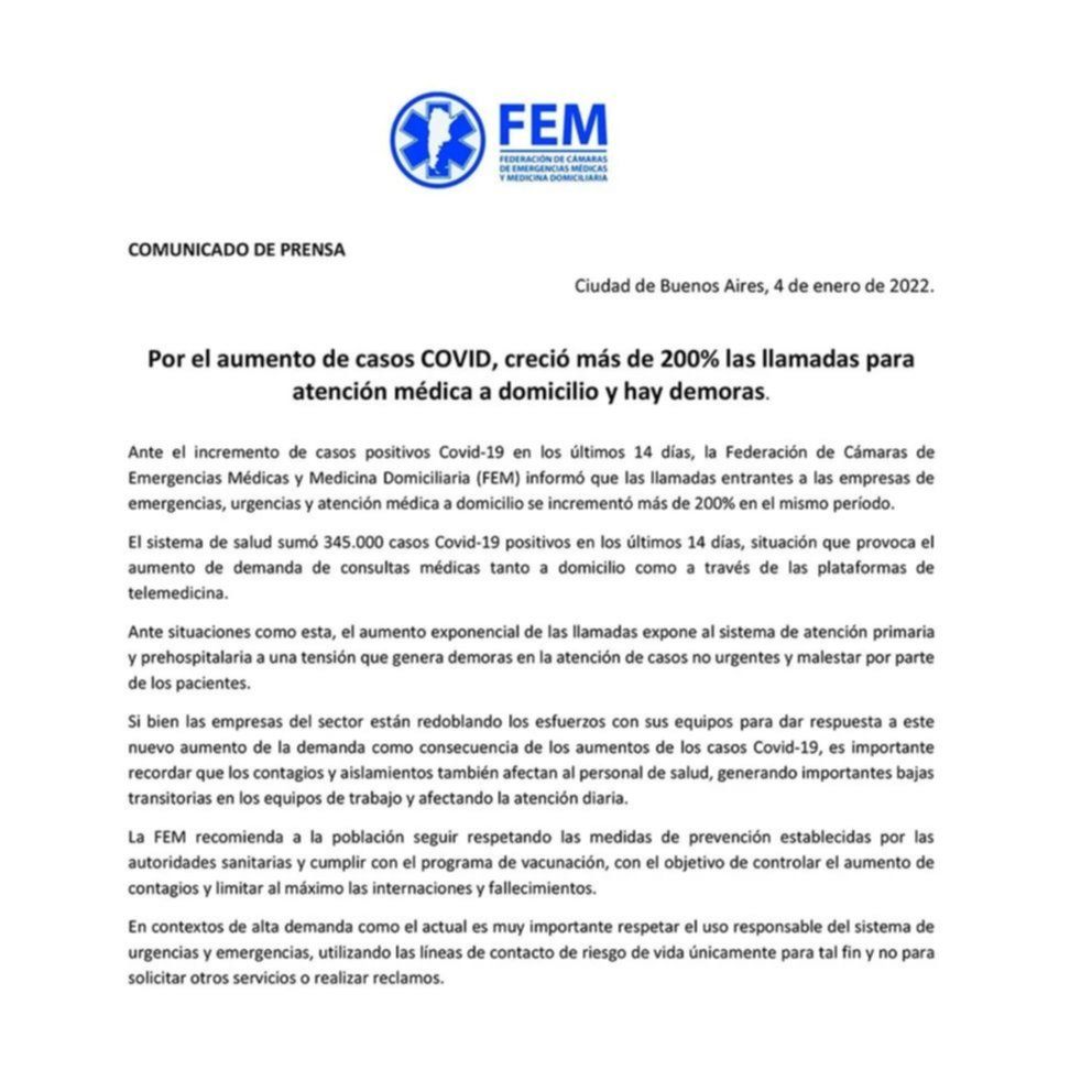 Por su parte, los servicios de emergencias médicas y medicina domiciliaria también están haciendo malabares para dar respuesta ante tanta demanda. En las últimas horas, la Federación de Cámaras de Emergencias Médicas y Medicina Domiciliaria (FEM) a través de un comunicado, informó que “desde el 20 de diciembre pasado a la fecha, las llamadas entrantes a las empresas de emergencias, urgencias y atención médica a domicilio se incrementaron de manera ‘exponencial’ generando ‘tensión’ en el sistema y ‘malestar’ entre los pacientes”.