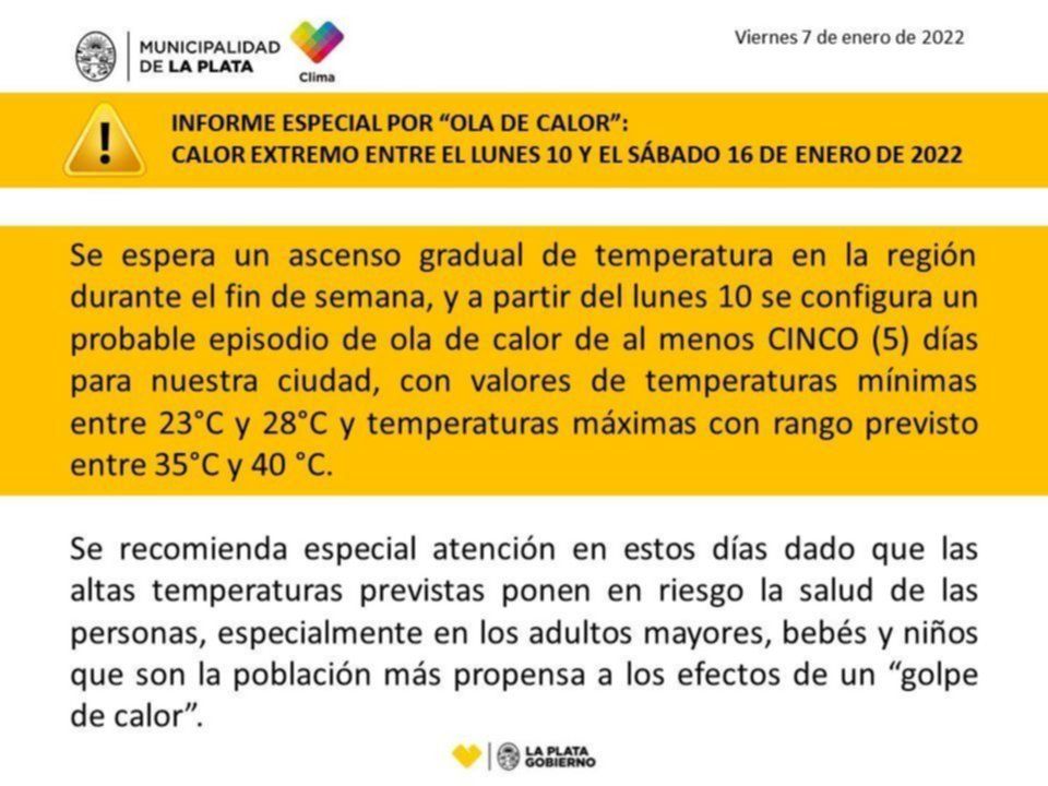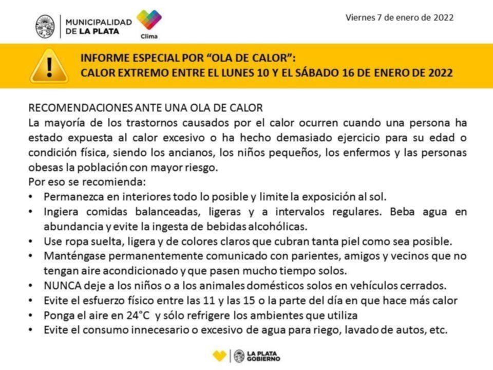 A su vez, recoendaron “especial atención en estos días dado que las altas temperaturas previstas ponen en riesgo la salud de las personas, especialmente en los adultos mayores, bebés y niños que son la población más propensa a los efectos de un golpe de calor”; al mismo tiempo que solicitó el uso responsable de la energía eléctrica y el agua, para evitar inconvenientes vinculados a la prestación de estos servicios.