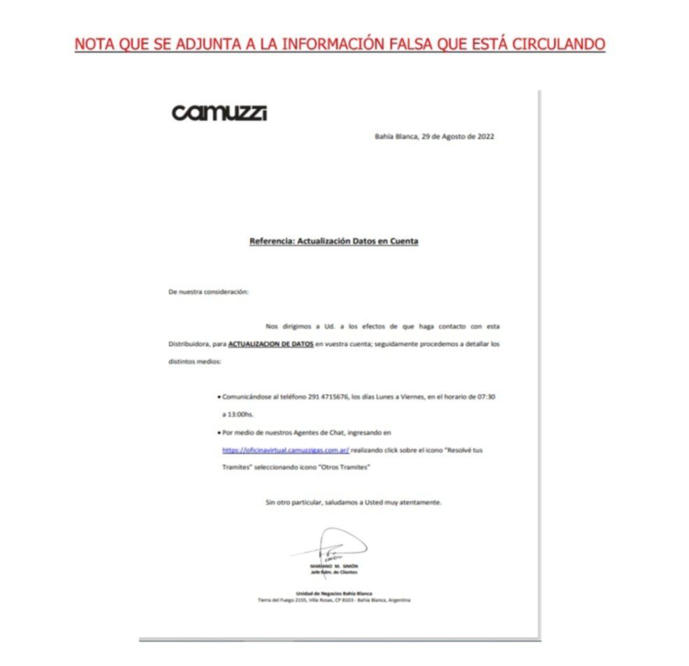 "Camuzzi lamenta que se haya utilizado esta vía de contacto con este grupo de usuarios para generar temores infundados, y desconoce los motivos detrás de esta desinformación. Ante cualquier inquietud los usuarios pueden comunicarse con telefónicamente al 0810-555-3698 de lunes a viernes de 8 a 18", concluyeron.