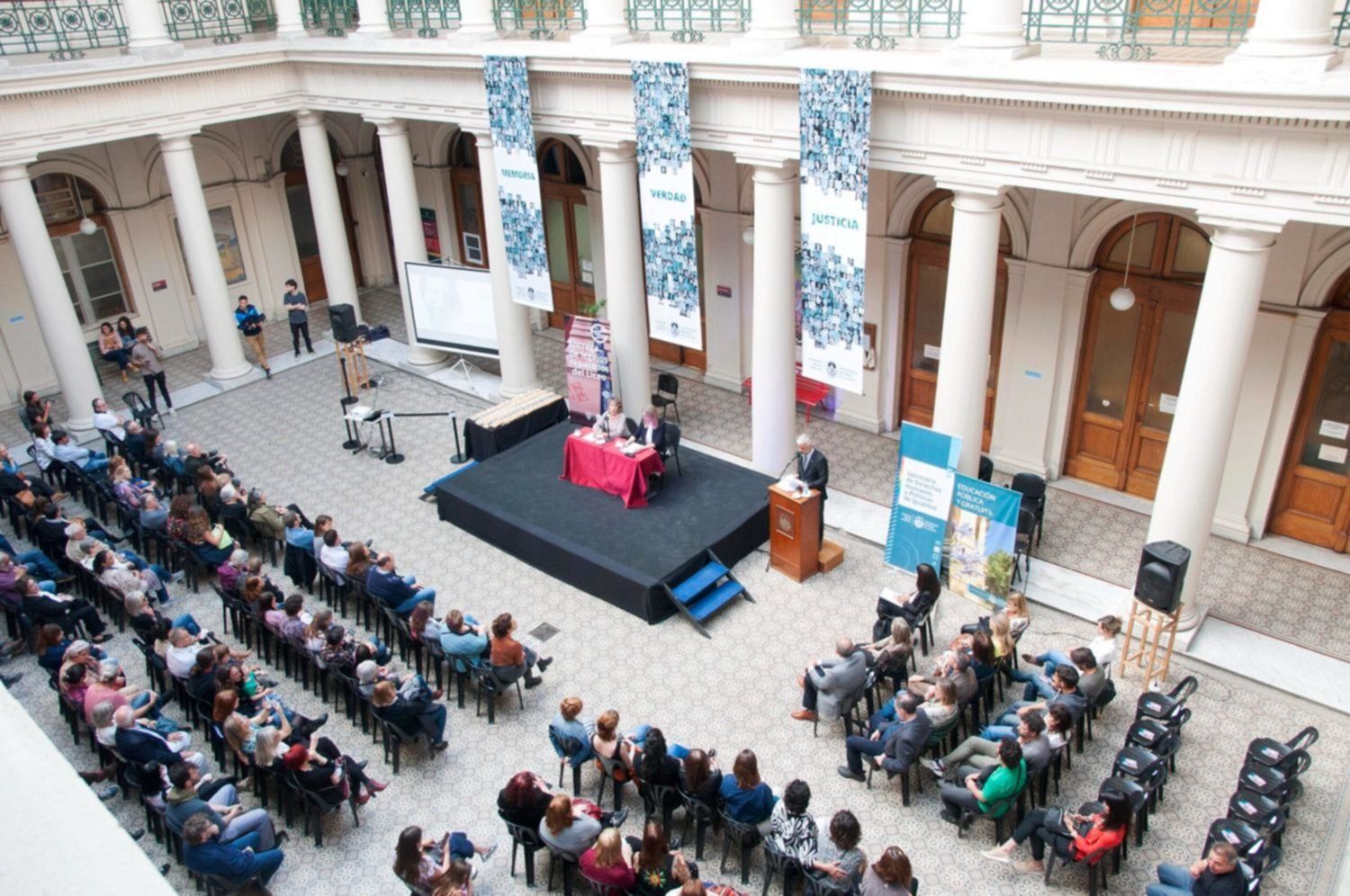 El acto homenaje tuvo lugar en el patio central del Rectorado y estuvo encabezado por el presidente de la Universidad, Martín López Armengol. Lo acompañaron la secretaria de Derechos Humanos y Políticas de Igualdad, Verónica Cruz; el secretario Académico, Aníbal Viguera; el prosecretario de Pregrado, Darío Esteves y la directora del establecimiento educativo, Julieta Miranda.