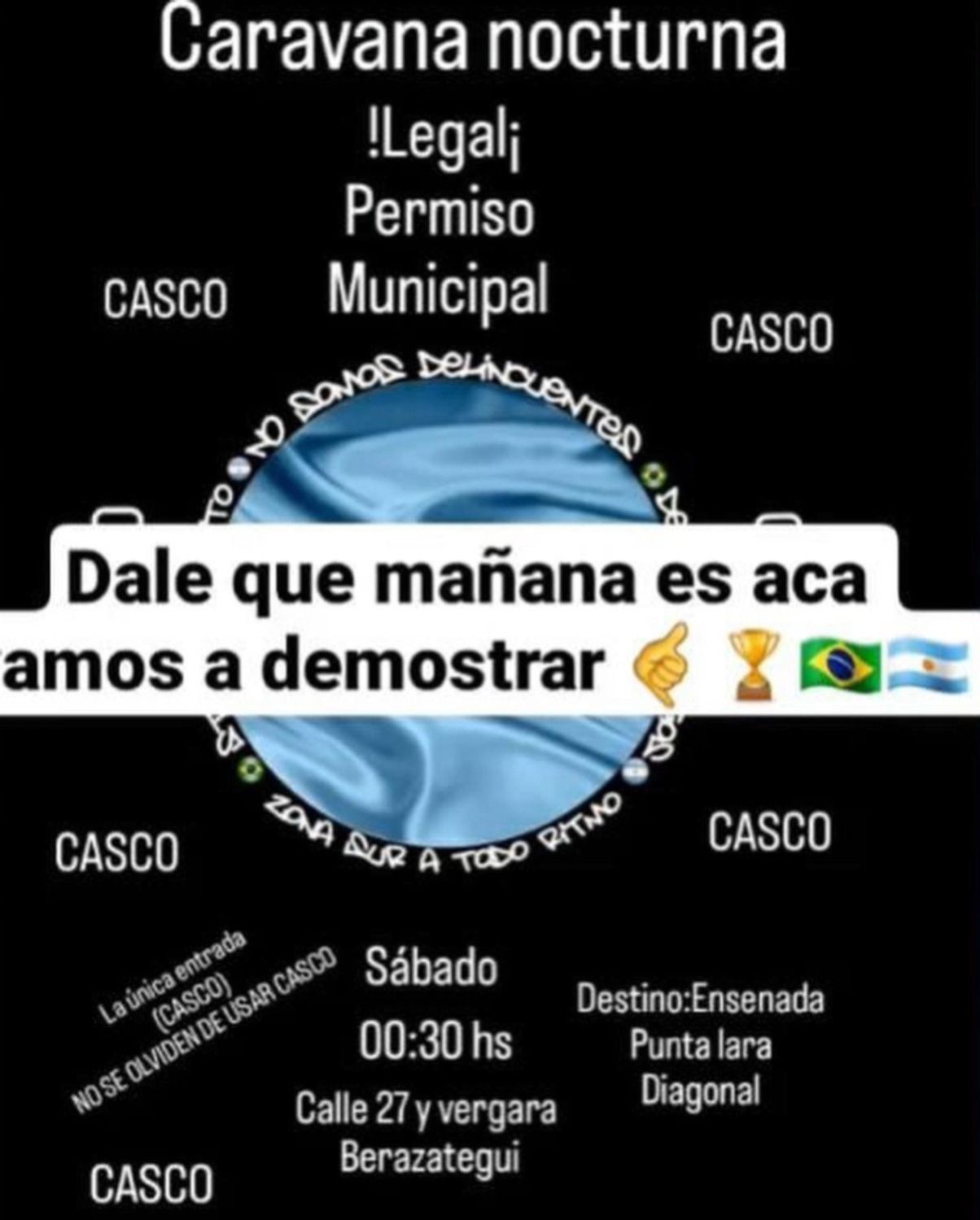 En ese marco, quienes encabezan la concentración informaron a las autoridades que eran allegados de Lautaro Coronel, más conocido como El Noba, el cantante de la "cumbia 420" que murió en junio pasado víctima de una caída en su moto. También dijeron que la juntada tenía como objetivo hacer un vídeo para concientizar a los motoqueros para que usen casco. "Tenemos que destacar que efectivamente todos tenían casco, así que ojalá que sirva", dijo a 0221.com.ar Martín Solobodian, el secretario de Seguridad de Ensenada.