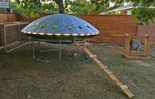 Efectivamente, la frentista transformó su antiguo gallinero y lo convirtió en una nave espacial. La construcción tiene un diseño realmente innovador, cuenta con una cama elástica como base y luces Led de color verde.