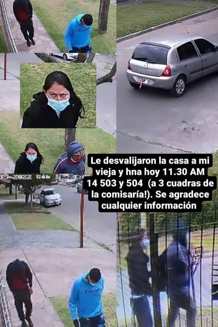 Tras el hecho, solicitaron las cámaras de seguridad de los vecinos y pudieron ver a los sospechosos, una mujer y dos hombres que caminaban mirando diferentes casas y trataban de agachar la cabeza para no ser filmados. Todos tenían barbijo y uno de los jóvenes tenía también guantes.