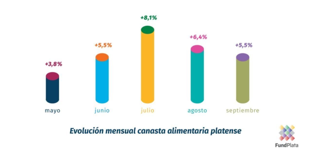 La canasta alimentaria en la ciudad de La Plata se incrementó 5,5% en el mes de septiembre y registró así una leve baja respecto de agosto, en que había subido 6,4%. Los datos surgen del relevamiento llevado adelante por la Fundación FundPlata en nuestra ciudad.