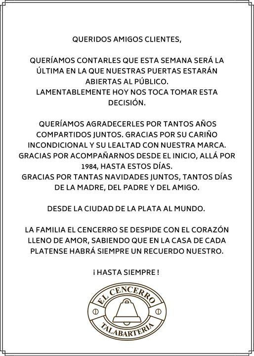 “Gracias por su cariño incondicional y su lealtad con nuestra marca. Gracias por acompañarnos desde el inicio, allá por 1984, hasta estos días. Gracias por tantas navidades juntos, tantos Días de la Madre, del Padre y del Amigo", expusieron los dueños de El Cencerro.